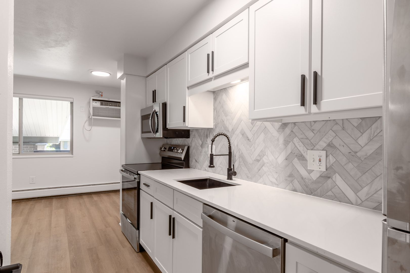 Portals Apartments feature thoughtfully redesigned 1-bedroom apartment homes with well-appointed interiors. Our renovated apartment homes (coming soon!) include quartz countertops, stainless steel appliances, elegant luxury vinyl plank flooring, new shaker-style cabinetry and modern lighting and hardware fixtures.